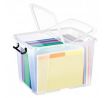 Transparentný robustný multifunkčný box z plastu s vekom, stohovateľný pri nepoužívaní. Motýlie veko na otváranie z 2 strán z dôvodu ľahšieho prístupu, 2 pevné rukoväte slúžiace na prenos boxu a súčasne ako klip na pevné uzatvorenie boxu. Materiál recyklovaný PP. Objem 40 litrov, romery 50 × 39,5 × 32 cm.