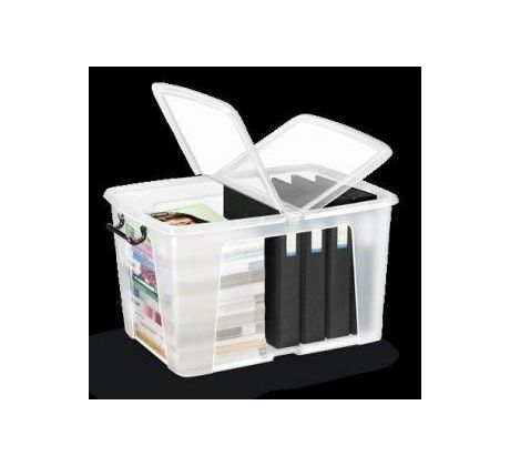 Transparentný robustný multifunkčný box z plastu s vekom, stohovateľný pri nepoužívaní. Motýlie veko na otváranie z 2 strán z dôvodu ľahšieho prístupu, 2 pevné rukoväte slúžiace na prenos boxu a súčasne ako klip na pevné uzatvorenie boxu. Materiál recyklovaný PP. Objem 65 litrov, romery 59 × 45 × 35 cm.