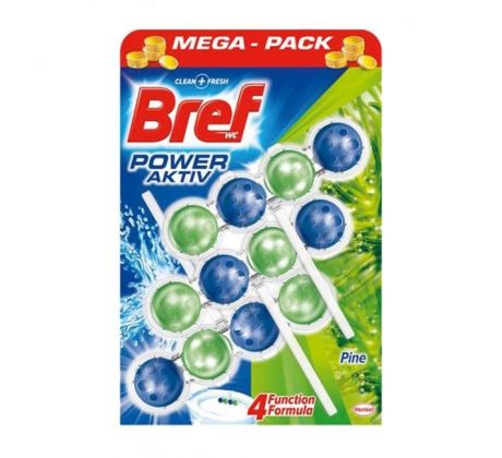 Tuhý WC blok Bref je vo forme 4 guľôčok s receptúrou so 4 funkciami - dokonalá čistota, čistiaca pena, ochrana proti vodnému kameňu a sviežosť. S atypickým tvarom, ktorý sa hodí pre všetky toalety. Certifikovaný ako odolný voči náhodnému otvoreniu deťmi (zdroj Nem. Inštitút pre Normalizáciu - norma DIN EN 862 2006). Vôňa borovice.
