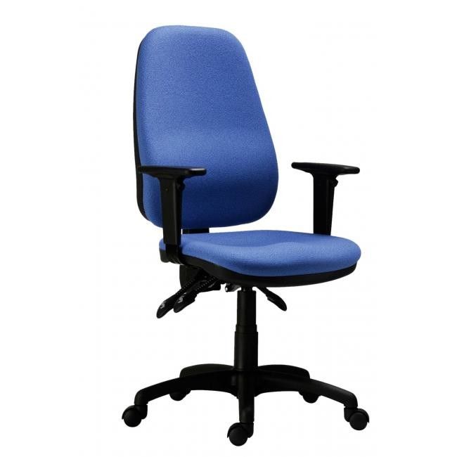 Kancelárska pracovná stolička s vysokým operadlom s asynchrónnym mechanizmom (nezávislý nastaviteľný uhol medzi sedadlom a opierkou), nastavením výšky operadla mechanizmom up‑down a plynovým piestom k nastaveniu výšky sedadla. Plastový kríž, nosnosť 120 kg. Farba modrá. Možnosť objednať podrúčky AN060000 BR06.