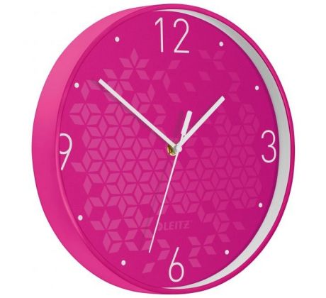 Quartz hodiny z produktového radu Leitz WOW. Tichý chod, dvojfarebný rám z pevného plastu v kombinácii so sklenenou prednou stranou. Jasný ciferník vo WOW farbách s veľkými číslicami, tri kontrastné ručičky viditeľné aj z diaľky. Priemer 29 cm, hrúbka 4,3 cm. Batéria AA nie je súčasťou balenia. Farba ružová.