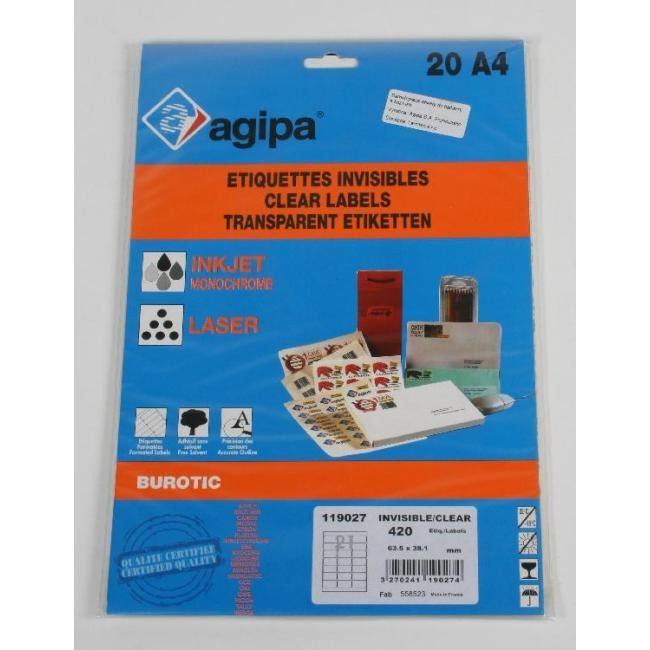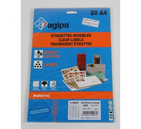 Značka:Agipa;Množstvo v balení:20 HAR.;Počet hárkov v balení:20 hárkov;Etikiet na hárku:21;Etikiet v balení:420;Farba:transparentná;Formát:A4;Prevedenie:pravouhlé;Rozmery etikiet:63,5 x 38,1 mm;Určenie:laserová aj atramentová tlač;