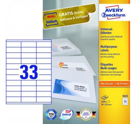 Farba:biela;rozmery etikiet:70 x 25,4 mm mm;etikiet na hárku:33;Množstvo v balení:100 KS;Značka:Avery Zweckform;určenie:laserová aj atramentová tlač;