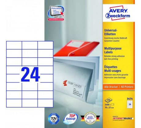 etikiet na hárku:24;Farba:biela;rozmery etikiet:70 x 37 mm;určenie:laserová aj atramentová tlač;Značka:Avery Zweckform;Množstvo v balení:100 HAR.;