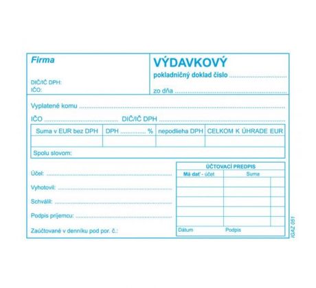 Výdavkový pokladničný doklad s DPH, formát A6, blok 100 listov.