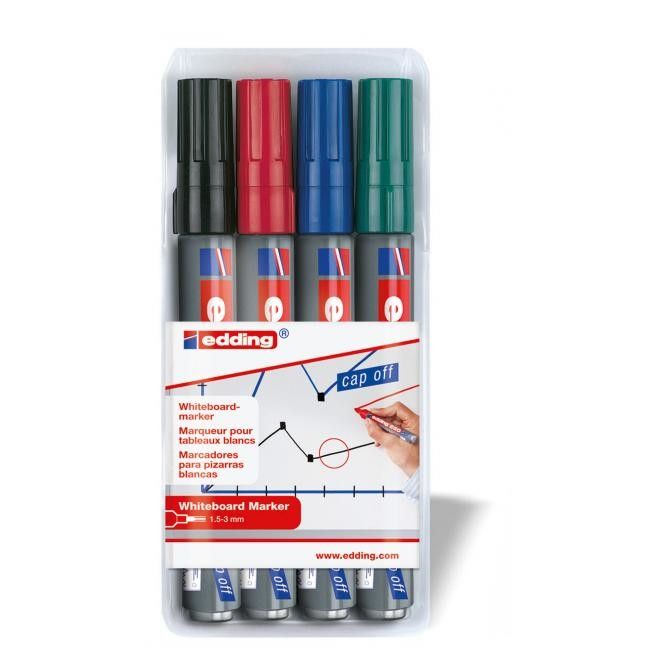 Popisovač na biele tabule, zasucha stierateľný. Plnený pigmentovým atramentom slabého zápachu bez prísady butylacetátu s vlastnosťou "Cap off", zabraňujúcou vysychaniu atramentu pri otvorenom hrote aj niekoľko dní. Dopĺňateľný atramentom edding BT 30 alebo BTK 25. Hliníkové telo, vymeniteľný hrot. Hrot okrúhly, šírka stopy 1,5 - 3 mm. Dodávaný v sade 4 ks.