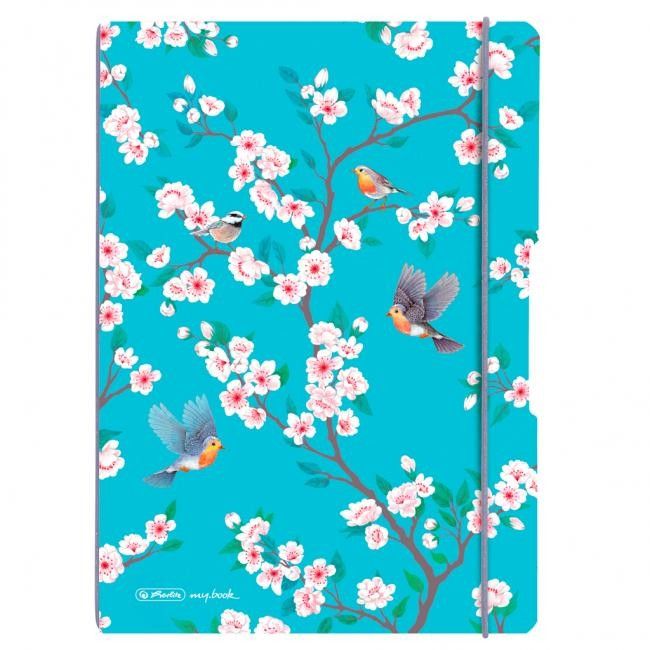 Zošit my.book flex Ladylike Vtáky, zaoblené rohy, so sivou gumičkou na zatváranie.