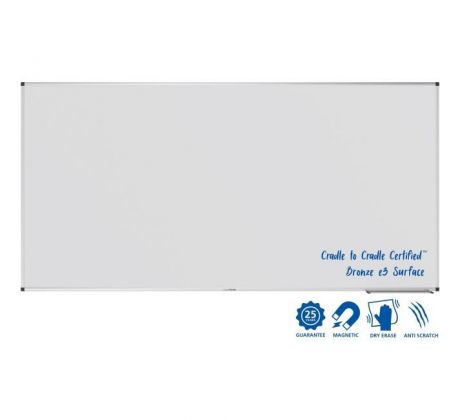 Robustná a udržateľná tabuľa na časté používanie v kancelárii, triede alebo v priemyselnom prostredí. Vhodná na písanie fixkami na tabuľu stierateľnými za sucha. Magnetický smaltovaný oceľový povrch s použitím e3 Ceramic Steel, ktorá má certifikáciu Cradle to Cradle Certified™ na úrovni bronzu. Hliníkový rám so sivými plastovými rohovými krytkami (Pantone 433C). Možno namontovať horizontálne alebo vertikálne. Vrátane držiaka popisovačov (30 cm), montážnej sady a montážneho návodu. Rozmery: 100 x 150 cm.