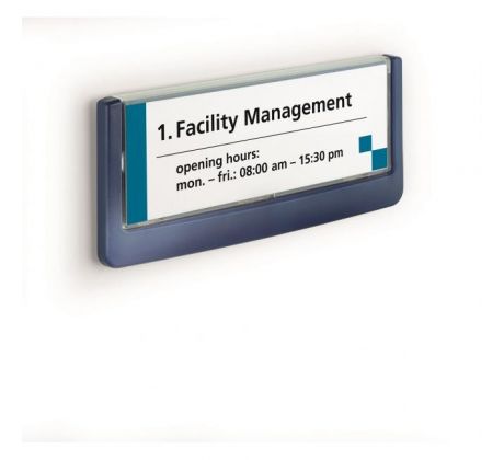 Moderná informačná tabuľka na dvere s lemom v atraktívnej modrej farbe. Predný panel sa otvára na jedno zatlačenie, a tým sa jednoducho sprístupnia vložené popisné papiere, ktoré sa môžu vymieňať podľa potrieb. Tabuľka je ideálna do kancelárií, úradov, škôl, univerzít a hotelov. Súčasťou balenia je montážna sada s názorným návodom. Namiesto pevného montovania môže byť tabuľka k povrchu aj prilepená.